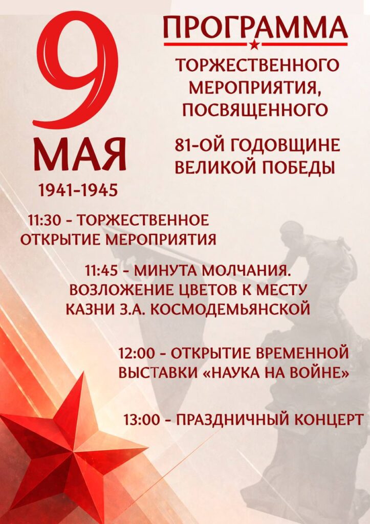 Дорогие друзья! 9 Мая — день, который объединяет сердца, наполняет их гордостью и благодарностью. Приглашаем вас провести его вместе с нами в Музее Зои Космодемьянской — месте, где история оживает и становится ближе. В этот особенный день состоится торжественное мероприятие, посвящённое 81-й годовщине Великой Победы. Вас ждёт открытие уникальной выставки «Наука на войне», рассказывающей о героизме советских учёных, чьи открытия помогли приблизить Победу и навсегда изменили ход истории. Праздничную атмосферу продолжит яркий концерт, наполненный любимыми песнями, живыми эмоциями и духом единства. На территории музея будет работать бесплатная полевая кухня — с настоящим вкусом памяти и тепла. 9 Мая в Музее Зои Космодемьянской — это больше, чем событие. Это живая связь поколений, это память, которую мы храним, и гордость, которую передаём дальше. Приходите всей семьёй. Будет важно, тепло и по-настоящему душевно.